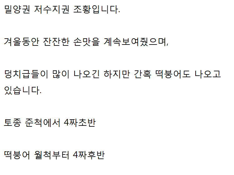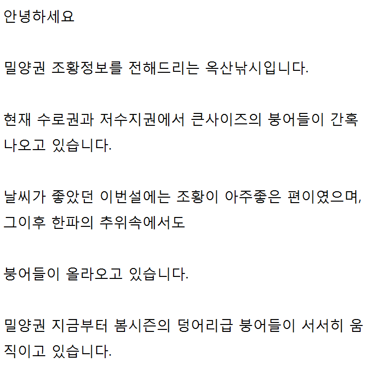밀양옥산낚시(3/6~3/12까지) 안녕하십니까(3/6일~3/12일까지 조황안내) 밀양권 조황정보를 알려드리는 밀양옥산낚시 입니다 한주동안 비,바람,꽃샘추위로 인해 출조하시는 조사님들의 조과에 많은 영향을 미쳤습니다. 수로권에서는 최고 4짜급까지 나오고 있었으며 월척급은 무난히 만나볼수 있었지만 마릿수 조황은 없었던거 같습니다 저2016-03-12