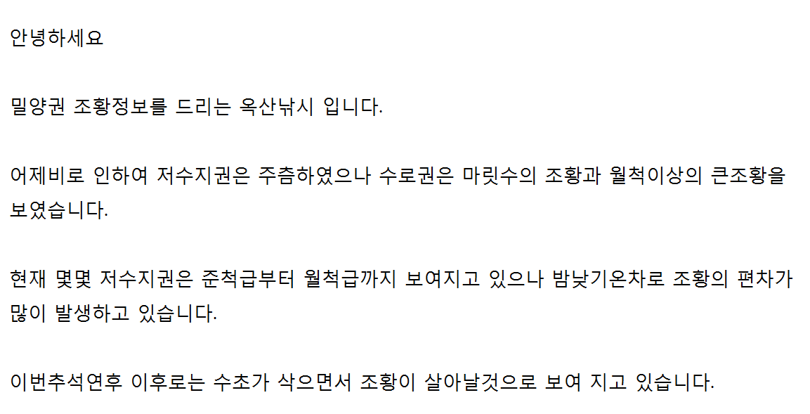 밀양옥산낚시(2/27~3/4까지) 안녕하십니까(2/27~3/4일까지 조황안내) 밀양권 조황정보를 알려드리는 밀양옥산낚시 입니다 수로권에서 주로 준수한 사이즈의 붕어가 보여지고 있으며 비로인해 차량진입이 어려울꺼 같습니다 조금 힘이 드셔도 짐을들고 도보로 포인트 진입을 하시어 편안한 낚시를 즐기시기 바랍니다. 저수지권 기복은 심한편2016-03-04