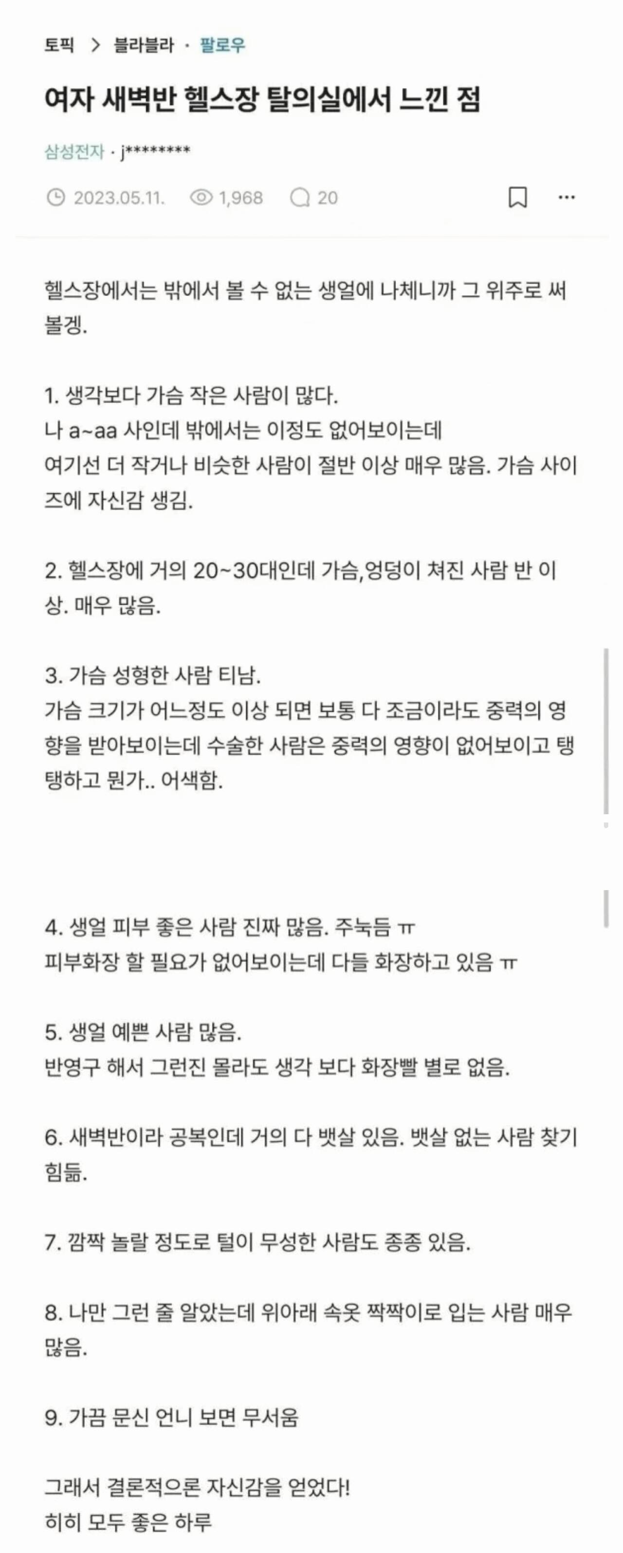 목록 이전글다음글 같은 여자가 본 헬스장 탈의실 느낌 댓글 15 인쇄 신고 마늘파종시기 IP : 291dcbbe691e481 날짜 : 2025-10-22 11:04 조회 : 5337 본문+댓글추천 : 6 다들 이쁘고 날씬해서 기가 죽을줄 알았는데..뚜껑 열어보니 별거 아니.......ㅎㅎ 추천 6 1등! 무유25-10-22 11:08 IP : 3c713062799065f 하하 좋은 헬스장 이네요 자신감을 찾아 줬으니 신고하기 추천 0 하하 좋은 헬스장 이네요 자신감을 찾아 줬으니 2등! 담여수25-10-22 11:54 IP : f005234bab57511 백문이불여일견인데 안 봐서 모름 신고하기 추천 0 백문이불여일견인데 안 봐서 모름 3등! 하드락25-10-22 12:02 IP : 6d0e74a58c245e2 그렇게 서로가 위안을 주지요. 신고하기 추천 0 그렇게 서로가 위안을 주지요. 노랑붕어™25-10-22 14:05 IP : 7465b23b3312f6e 목욕탕은 어떤 느낌일까??? ㅎ 신고하기 추천 0 목욕탕은 어떤 느낌일까??? ㅎ 라온공룡25-10-22 14:06 IP : 342be587e276da6 저도 안봐서 ㅎㅎㅎ 신고하기 추천 0 저도 안봐서 ㅎㅎㅎ 어인魚人25-10-22 14:24 IP : f93921784e70336 뭐 남탕도 비스무리 하지요^^ 신고하기 추천 0 뭐 남탕도 비스무리 하지요^^ 또다시25-10-22 14:53 IP : 514732090ed1d76 여자들은 속옷 짝짝이가 이상한가? 신고하기 추천 0 여자들은 속옷 짝짝이가 이상한가? whwe200025-10-22 17:02 IP : d40f04ef61122dd ㅋ 신고하기 추천 0 ㅋ rose25-10-22 19:23 IP : a44bc5543bb9df2 ㅋㅋㅋ 아스팔트위의 후라이 보단 낫지예^^* 신고하기 추천 0 ㅋㅋㅋ 아스팔트위의 후라이 보단 낫지예^^* 난감하네25-10-22 21:38 IP : 96247190af855fd ㅎㅎㅎ 신고하기 추천 0 ㅎㅎㅎ 물내음과붕어25-10-23 08:04 IP : c6620e8801d4c46 저도못봐서.2 신고하기 추천 0 저도못봐서.2 월조사6625-10-23 09:07 IP : d7ccb81896c347e 나두 가서 보구싶네~~ㅎ 신고하기 추천 0 나두 가서 보구싶네~~ㅎ 욕심많은달빛25-10-23 12:55 IP : a089fca1cc3f3c5 여자들은 데이트할 때나 외출할 때 혹시 모를 이벤트를 대비해서 속옷을 세트로 입고 이벤트 기대감이 전혀 없을 때는 아무렇게나 입는다더군요. 신고하기 추천 0 여자들은 데이트할 때나 외출할 때 혹시 모를 이벤트를 대비해서 속옷을 세트로 입고 이벤트 기대감이 전혀 없을 때는 아무렇게나 입는다더군요. 생활낚시인25-10-23 14:38 IP : e918351ae4e8a13 단독수초는 들이댈만한 좋은 포인트인데 아쉽네요 돈주고도 입장을 못하니... 신고하기 추천 0 단독수초는 들이댈만한 좋은 포인트인데 아쉽네요 돈주고도 입장을 못하니... 실바람25-10-24 22:22 IP : 501fa68c68cad29 무우척 궁금 합니다. 신고하기 추천 0 무우척 궁금 합니다. 목록 이전글다음글 하단에 목록보기